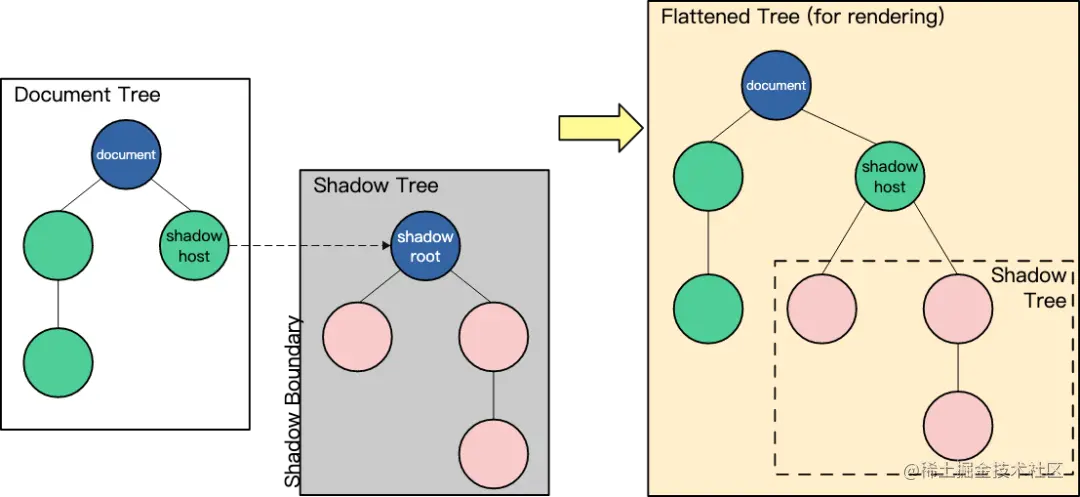 shadow DOM允许将隐藏的DOM树附加到常规的DOM树中-它以shadow root节点为起始根节点,在根节点的下方,可以是任意元素,和普通的DOM一样。