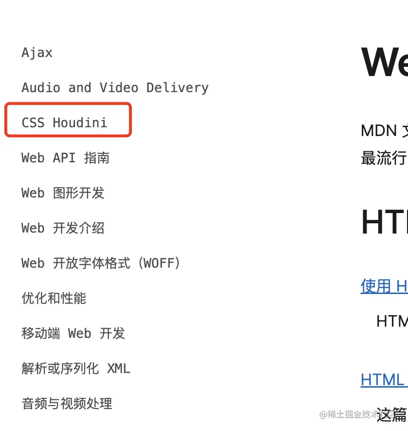 这不,这天我正闲心,所以刷了刷 MDN 的网站。点到Web 开发者指南这页下,看到了一个有点陌生的词汇——CSS Houdini。