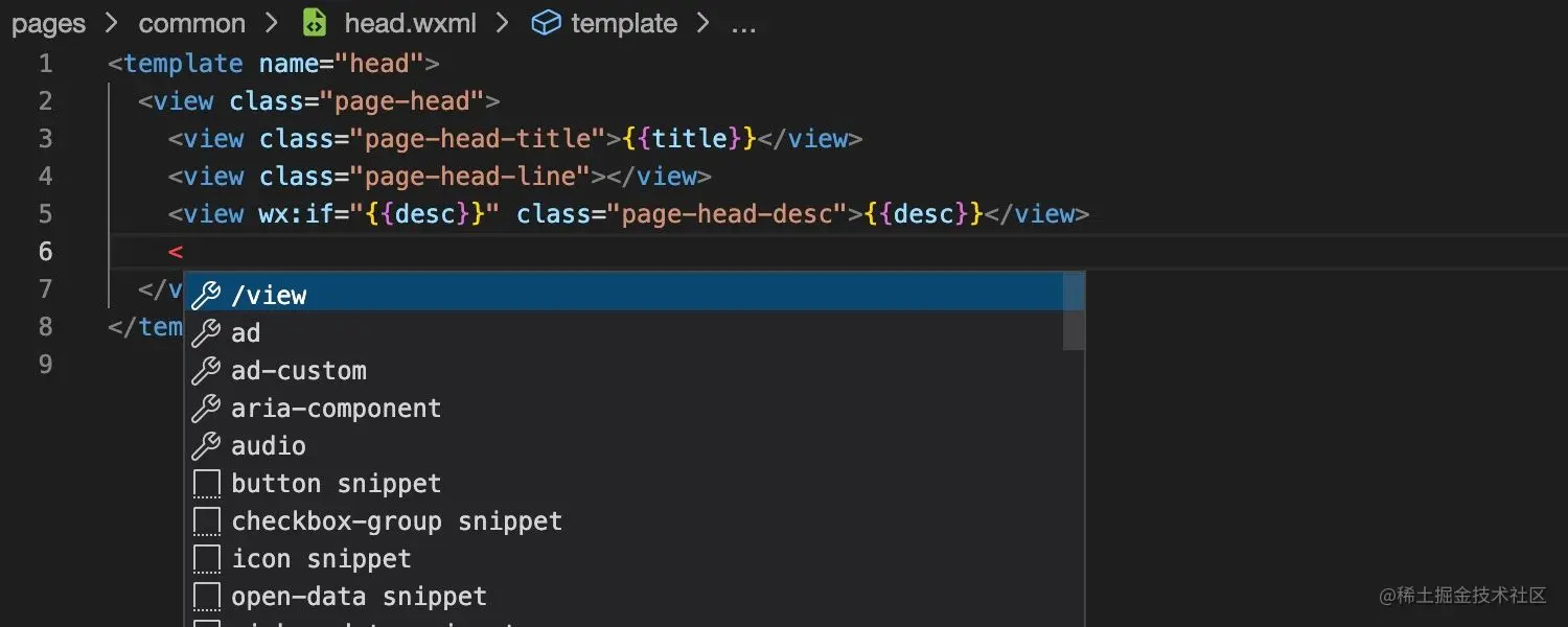 FinClip Studio 会在用户输入某些字符之后,自动弹出一组可供选择的代码片段,开发者选择其中一个就可以自动完成代码的书写。