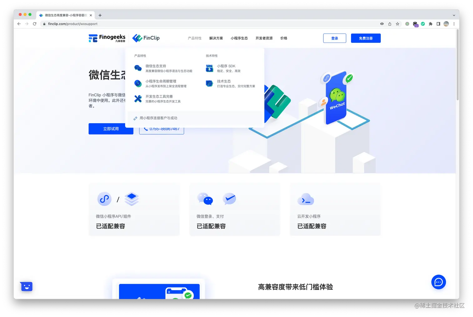 我们在 FinClip 产品官网中,新增了「微信生态支持」,「小程序生命周期管理」,「开发生态工具完善」,「小程序 SDK」介绍页面,您可以通过其中了解 FinClip 的产品功能介绍。