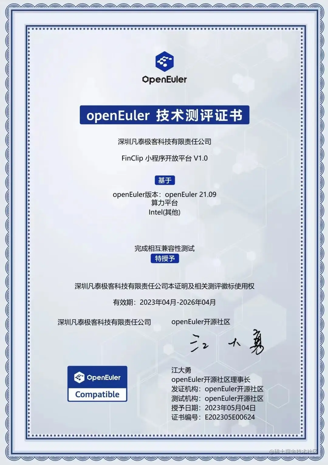 5月凡泰极客旗下「FinClip 小程序开放平台」与服务器操作系统「 openEuler 」完成兼容性测试。测试结果显示:经过严格联合测试,双方软件相互兼容良好、运行稳定。本次评测结果是对于凡泰极客产品与技术创新实力的再认证。未来,双方将继续携手,加速信创数字建设。