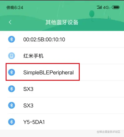 烧写完成后,打开手机蓝牙能够搜索到 SimpleBLEPeripheral