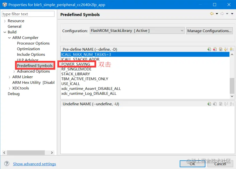 1)“POWER_SAVING”,代表代码中包含了“POWER_SAVING”宏,在代码中的作用是表示“可 进低功耗模式”,当协议栈检测到没有任务在执行时,即进入低功耗。