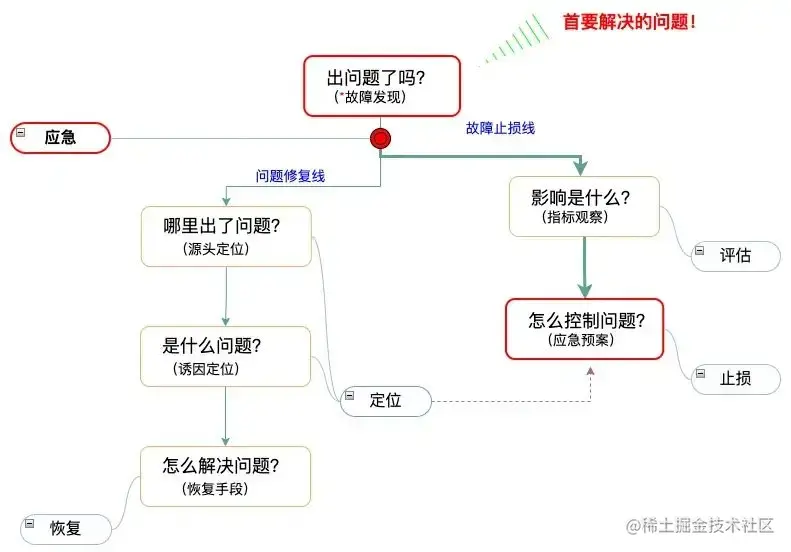 | · 出问题了吗? 能看到问题这是治理的基础。业务应该在业务指标、功能指标、统计指标、工程指标各个维度都有核心覆盖(参考第三章),这是主动发现要求,覆盖每个核心输出。其次,发现时延必须在5分钟内,每个核心发现能力告警都要通报到大群里,和应急联动起来。 · 影响是什么? 故障发生时,需要一个或者多个角度去衡量和评估故障的影响具体是什么,这些角度应该能直接反映到用户体验,是用户体验下降的一种量化。这种量化在事中可以提供应急决策帮助、在事后可以提供故障定级支持。在量化具备一定准确度后可以指导我们的治理工作提升到自动决策和容灾层次,导向一个更加效率的方向。 · 怎么控制问题? 核心是各类容灾能力建设,面对基础设施异常、服务挂机、流量激增、功能异常等等各个情况覆盖。 · 哪里出了问题? 找到源头,是解决问题的第一步。问题会层层蔓延到业务顶层输出,最初出现问题的节点是关键,要尽快找到这个节点。通过看板、通过监控、通过可观测渠道等,尽快找到源头,有效降级 mttr。 · 是什么问题? 问题不会无缘无故发生,总会存在一个“变量”致使问题触发,找到了这个“变量”,就回答了“是什么问题?”。这个变量就是诱因,如变更(数据、配置、程序等)、实验、流量、干预、特征、网络、dns、带宽等。 · 怎么解决问题? 找到问题诱因后,就可以针对性去解决这个问题。凡是操作引入的,大多是逆操作,如变更引入的就回滚变更操作;外因引入的,较难处理,可能需要一些预案能力来辅助。还有一点需要特别注意,无论哪样地解决手段,都要快,因为这个时间的系统,要么是有损的,要么是不稳定的(如已切流情况下,难以承担二次类似问题发生)。 |