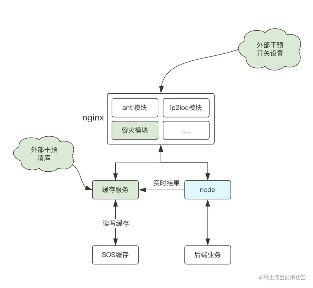 新建容灾模块 SearchGuard,负责缓存的读写。写入口在前端模块 node,在系统正常下会一直写,系统开启容灾缓存是关闭写入;读逻辑在业务 nginx 侧控制,在开关开启的情况下访问容灾缓存服务,如果拿到结果就返回,读取结果空就继续访问大搜下游。
