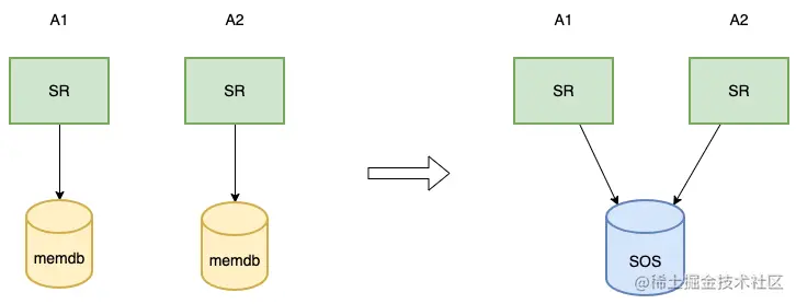 SR 是有状态服务,其必须与 memdb 服务按照1:1的实例数部署,计算与存储紧密耦合,如果热词流量打散到其他实例,会丢失该实例的缓存数据。优化方案是改造 SR 为无状态服务,将计算和存储解耦合,存储改造为旁路模式,实例间共享。