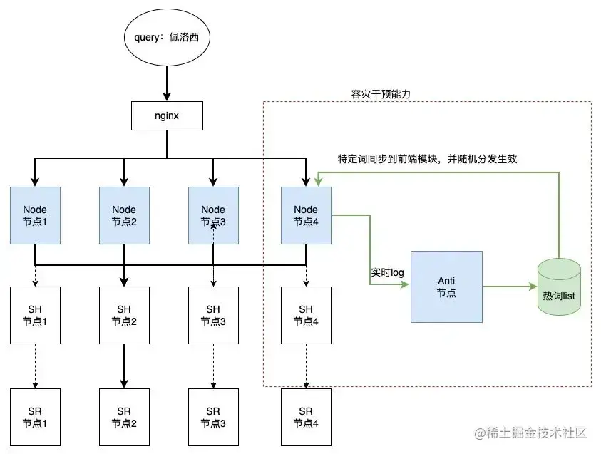 搜索的 SR 和 SH 服务都是本地缓存,分环时根据 query 来分,也就是每个节点是有状态的,SH 自身拥有降级措施,可以利用快速返回有效解决热词 Query 的问题,但当 QPS 很高(如10倍涨幅)的情况下,SH 会出现 GC 卡顿崩溃的现象。如出现全网关注的新闻事件,同一关键词的流量打垮单台。长线方案是优化 SR 和 SH 架构,短线方案我们输出一种容灾能力,以干预的方式将超高关键词打散。