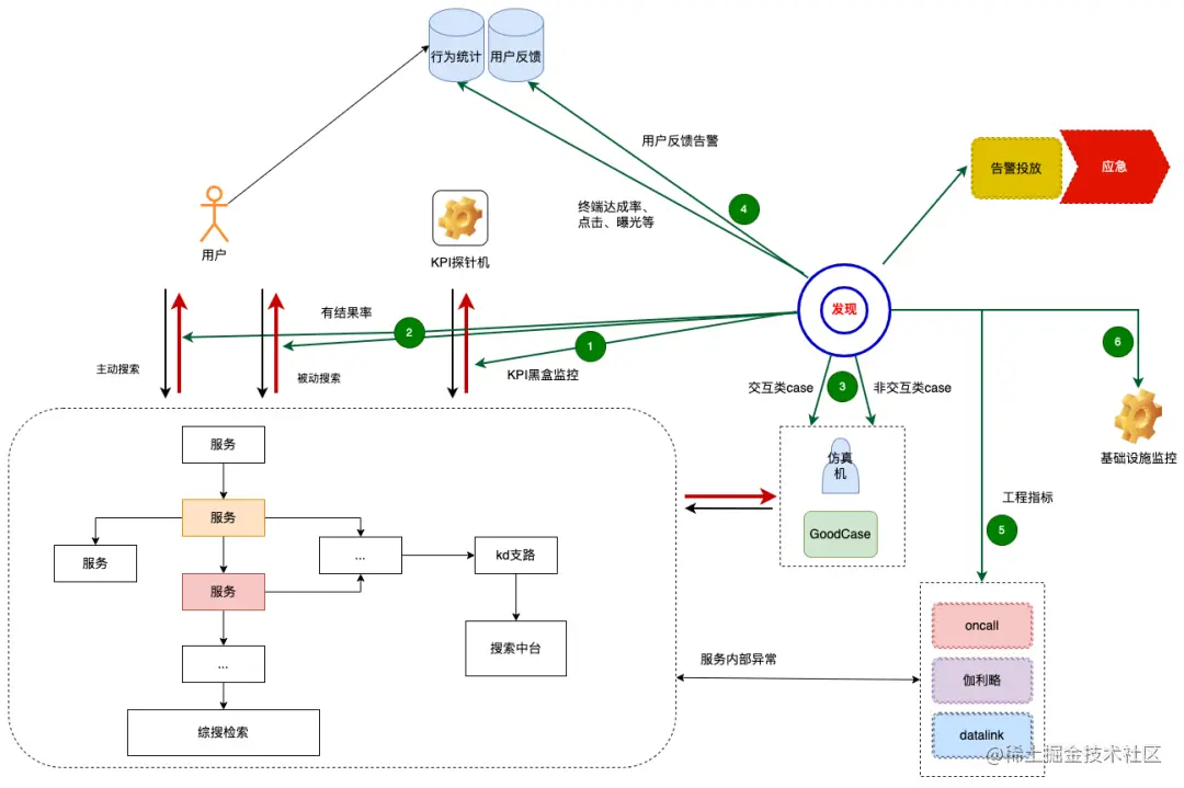 上面的指标都是以用户的维度,在系统外去监视服务,工程指标是深入系统内,在服务的关键调用链上去建立核心监控,是一种服务粒度的监控。搜索在工程指标建立和监控上注重如下几个事项: