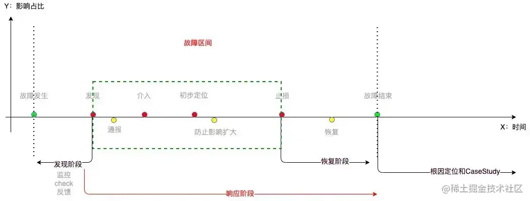 在发现和容灾之间应该有一个纽带,能够迅速决策操作哪类容灾能力并迅速执行起来,这就是应急框架的核心意义。如果所有的容灾能力都是自动触发的,那么应急的重要性就不会这么高,如果不是,这个能力是必须要建设的。MTTR 可以拆分为三部分:从发现到介入的时间、从介入到开始执行止损动作的时间、止损操作后到系统恢复的时间。其中第三部分可以理解是容灾生效时间,因为容灾能力基本都是速效手段,这类时间基本可控。那么,核心需要优化的时间就是前面两部分,也就是上图中方框内的时间。