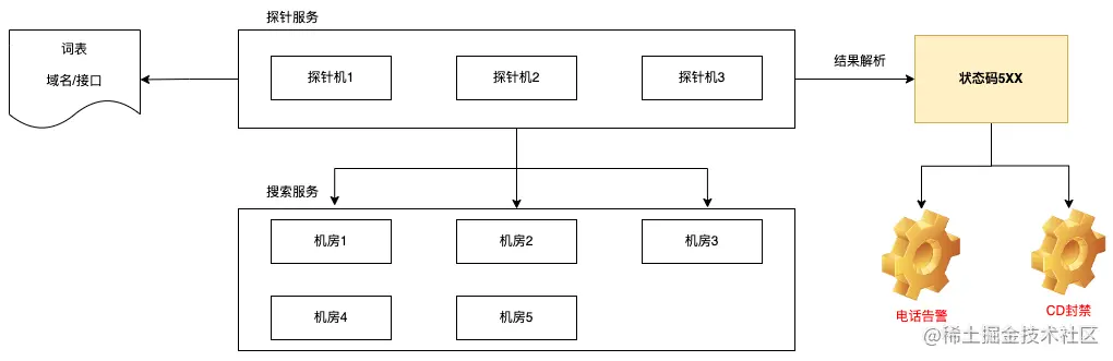 KPI 黑盒告警是大搜最重要的一个监控项,它以探针机的方式对搜索系统持续打词(穿透缓存),对状态码为 5XX 的打词结果就会形成 KPI 电话告警,并自动封禁 CD 平台的所有变更动作,直到系统恢复。这个指标直观体现了大搜是否有恙,是切流决策的一个重要依据。