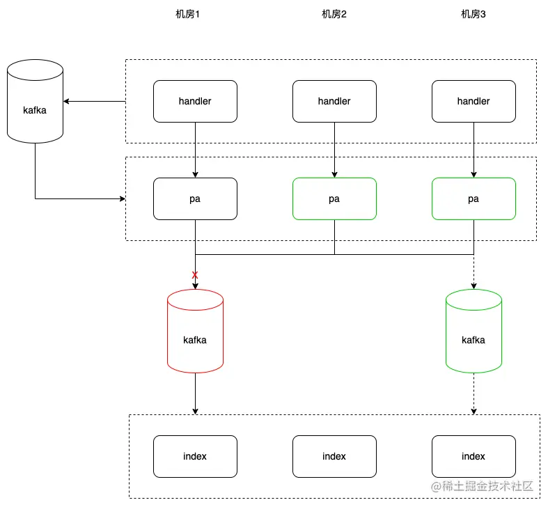 在索引的离线制作上,我们梳理所有的单机房环节和跨专线问题,对阻塞点和高风险环节输出治理方案和容灾方案,避免单机房异常或者单专线异常引发全业务异常。如离线时效性通路治理,增加抓取后的处理服务多活和 kafka 容灾能力,彻底解决因专线、服务或者 kafka 异常引发的全断流问题,并建立起切流和兜底策略的容灾能力。