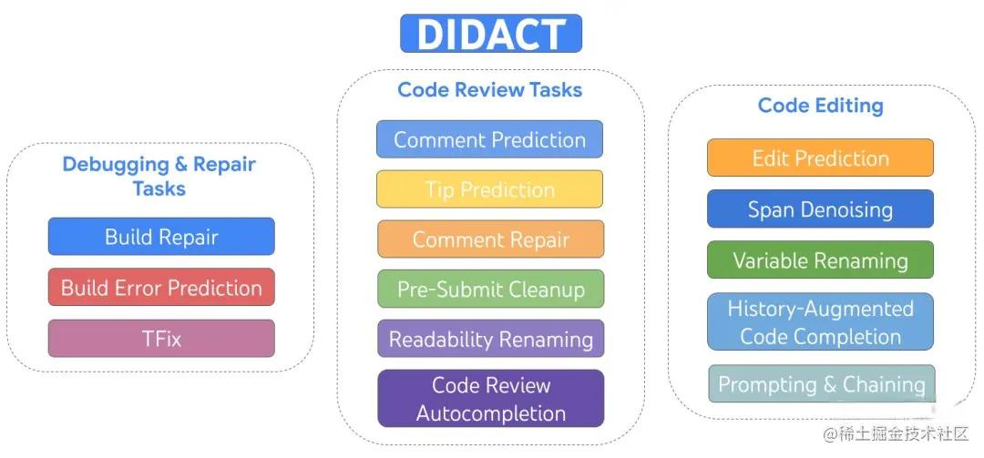 - DIDACT是一个多任务模型,训练了编辑、调试、修复和代码审查等软件开发活动。谷歌内部已经部署了三个基于DIDACT的工具,分别是Comment Resolution(用于解决代码审查中的评论问题)、Build Repair(用于修复编译错误)和Tip Prediction(用于预测代码修改的建议)。这些工具都受到了数千名内部开发者的热烈反馈。