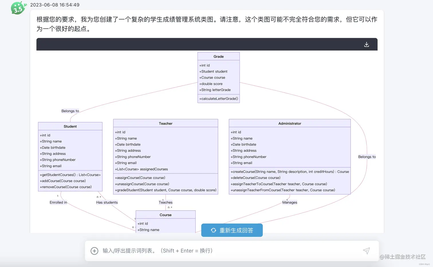通过ChatMindAI生成类图时,它可以根据您输入的需求和描述,快速识别出对象之间的关系,并自动构建出清晰的类结构。这样一来,您就能轻松地进行面向对象编程了。在这个例子,我让ChatMindAI生成一个学生成绩管理系统(经典课设,死去的记忆开始攻击我了)的类图,可以看到ChatMindAI生成的效果还是非常不错的,这个类图包含了学生、课程、成绩、教师和管理员等实体。它们之间的关系以及一些基本的方法也已经定义好了。您可以根据需要对其进行修改和扩展。