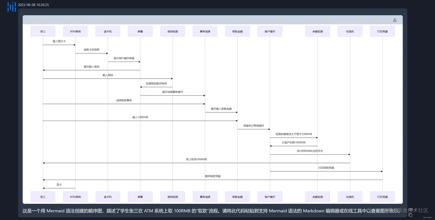 使用方式非常简单,只需在上方选择顺序图生成4.0,然后在输入框中输入需求(如课设题目)。在描述系统操作时,GPT-4.0会生成详尽的顺序图。它自动识别出系统中的对象、事件及消息传递,并按时间顺序展示它们之间的交互。随后,ChatMindAI将内容渲染成顺序图,并呈现给用户。