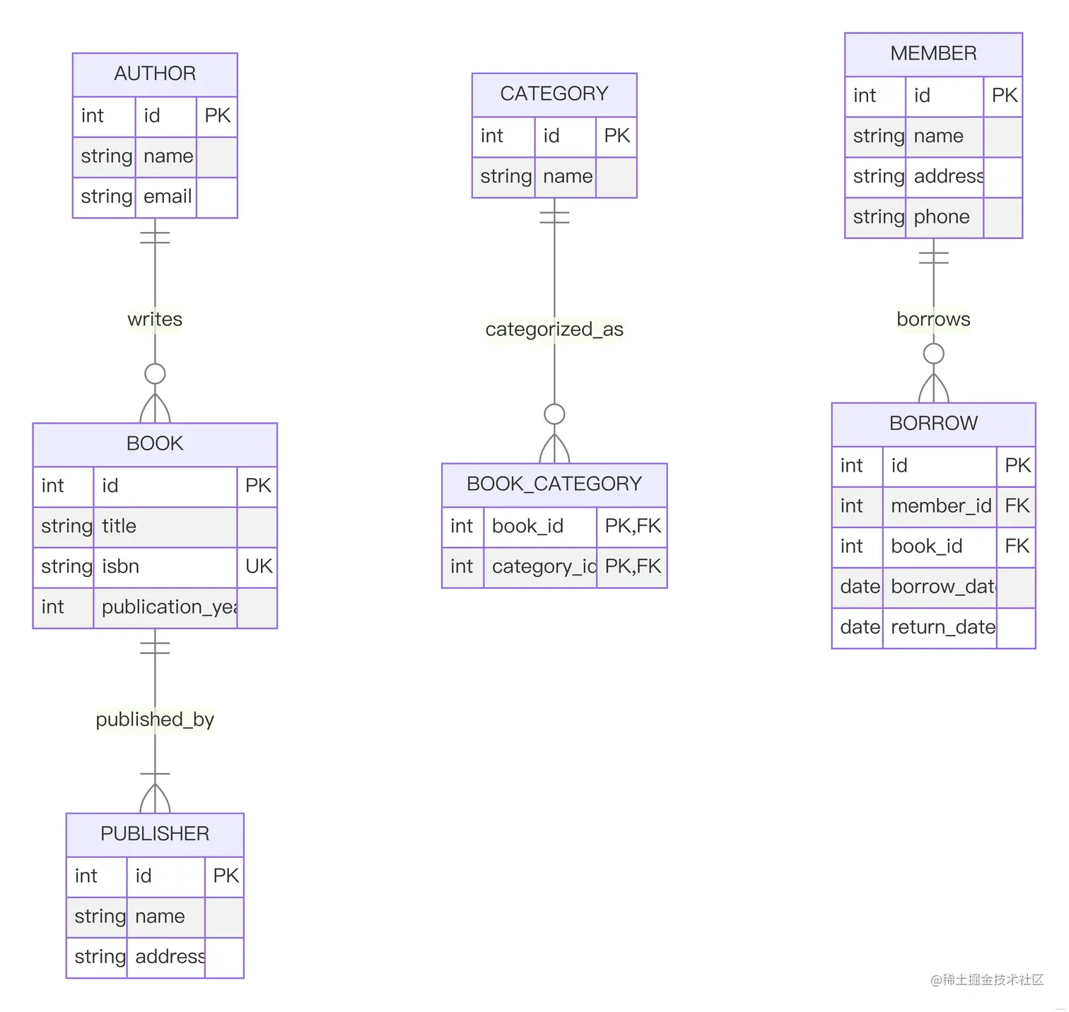 - 书(BOOK)可以属于一个或多个类别(CATEGORY),通过BOOK_CATEGORY实体表示