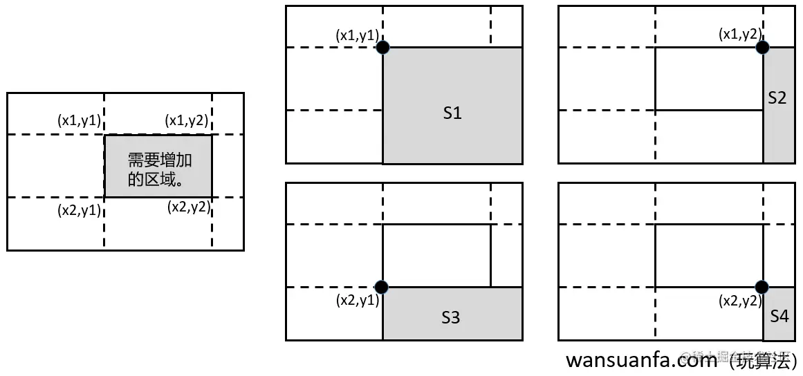 如下图所示,以 (x1,y1) 为左上角, (x2,y2) 为右下角构成一个区间,如果对这个区间内的每个元素增加 val ,只需要执行下面四步即可。