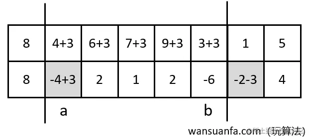 有了差分数组,如果对区间 [a,b] 每个元素加 3 ,不需要在一个个操作,只需要在两端修改即可,如下图所示。
