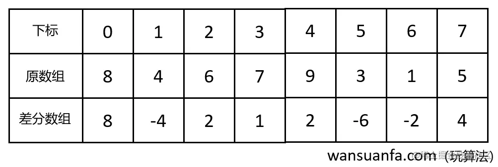 频繁对数组的一段区间进行增加或减去同一个值,如果一个个去操作,很明显效率很差,我们可以使用差分数组,差分数组就是原始数组相邻元素之间的差。定义差分数组 d[n] ,我们可以得到: d[i] = nums[i] − nums[i−1] ,其中 d[0] = nums[0] ,如下图所示。