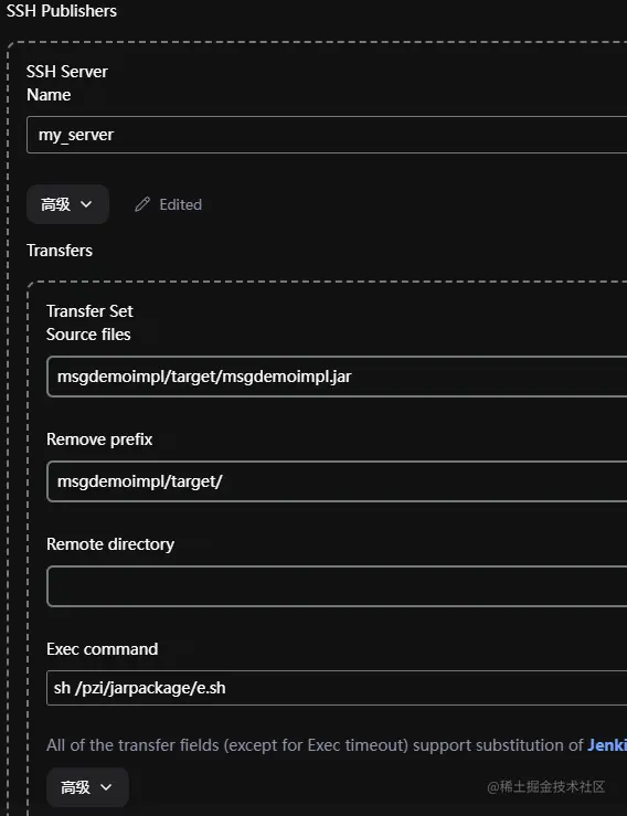 如果采用 ssh 的方式发送,需要注意这个 Remote Directory,如果构建的时候报错说找不到目录,ssh Publishers 的远程目录可能失效,那么就需要修改下图中的 Remote Directory。