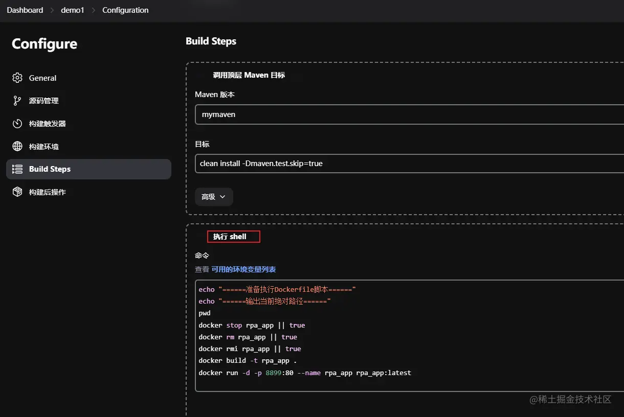 打包后的文件,会放到工作目录里面,我们对该目录中的 jar 包,使用 dockerfile 进行创建容器并且运行,就可以实现提交代码后,一键部署。