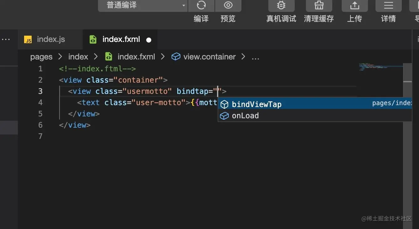 FinClip Studio 的代码补全功能中已经支持读取 js 文件中的已有方法,在编写的 xml 文件中,能自动读取 js 文件中的方法名称进行补全。