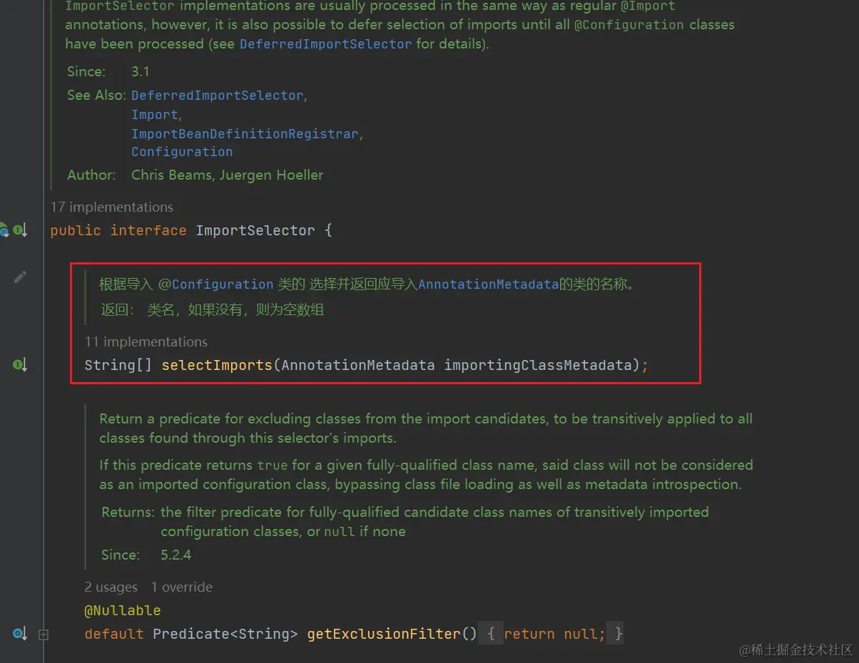 实现了ImportSelector 接口,准确来说实现了DeferredImportSelector接口,DeferredImportSelector接口和ImportSelector区别在于实现DeferredImportSelector接口的类,执行的时机较晚,所以叫Deferred
