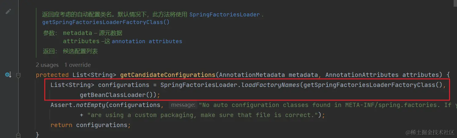 AutoConfigurationImportSelector中通过selectImports方法调用了 与spring扩展机制有关的SpringFactoriesLoader.loadFactoryNames 方法,对所有jar包中的spring.factories中属性为EnableAutoConfiguration的值进行解析,在该文件中其值通常为需要导入的配置类全类名,spring根据其返回的全类名数组 对配置类进行导入,再对配置类中指定的bean进行导入