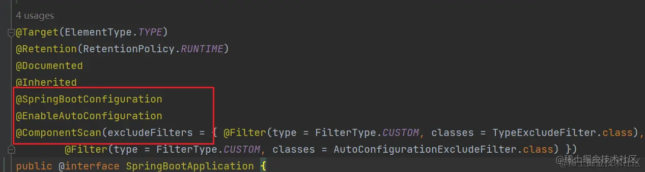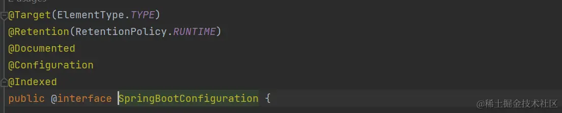 1. @SpringBootConfiguration 表示被修饰类是个配置类,虽然是个复合注解,但是点进去看也就是一个配置类