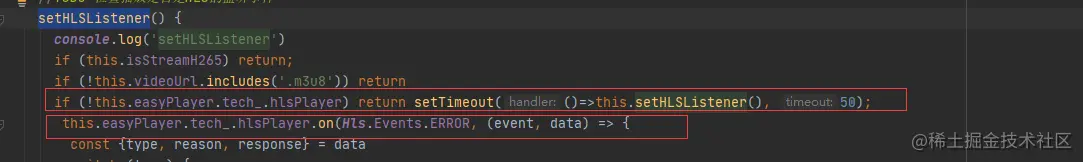 在调用的setHLSListener方法内,做递归进行监听视频流是否为H.265,如图: