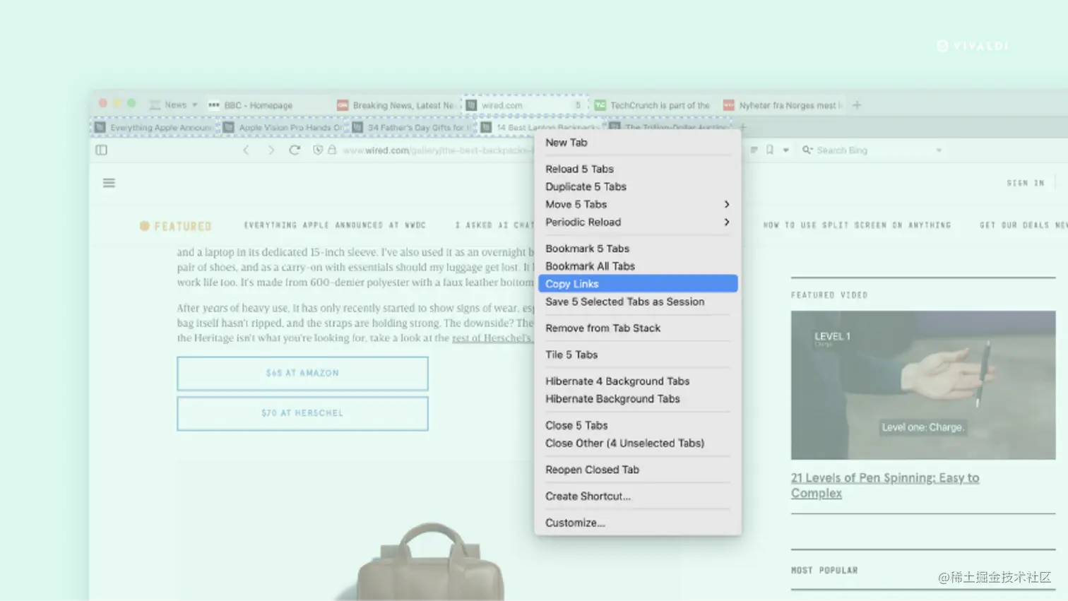 在 Vivaldi 6.1 中,你现在可以选择所有选定的页面并一次性复制多个网页链接。你可以在一个简单的操作中迅速与朋友分享你的酒店搜索或旅游行程,这个功能也同样可以在工作空间中使用。