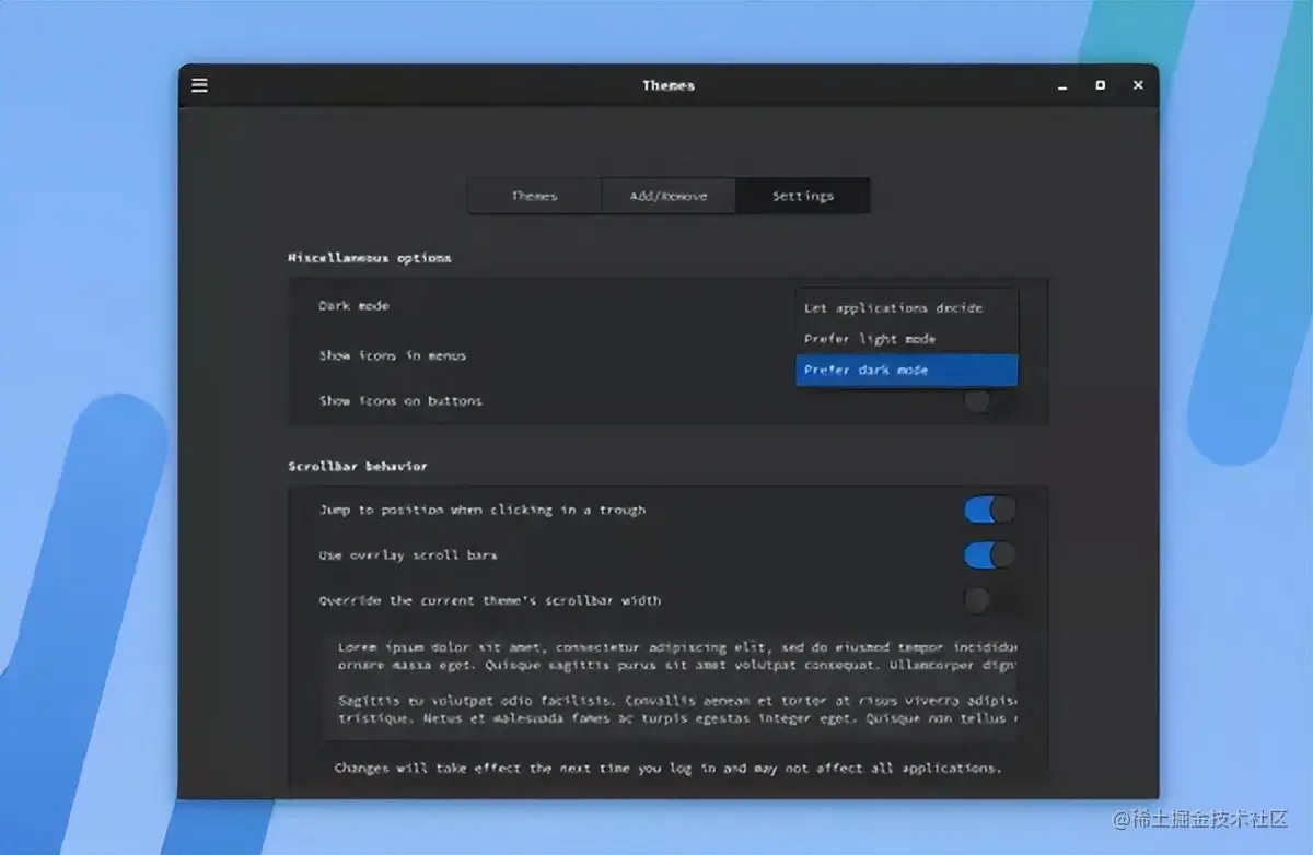 Cinnamon 5.8 有几个很酷的新功能,其中之一是 XDG 桌面门户支持,为 Flatpak 应用程序以及 GNOME/libadwaita 应用程序提供更好的兼容性,使得这些应用程序可以截取屏幕截图。此外,该功能还为支持它的应用程序带来了全局黑暗模式设置,共有三个选项可供选择,包括 Prefer light、Prefer dark 和 Let the applications decide。