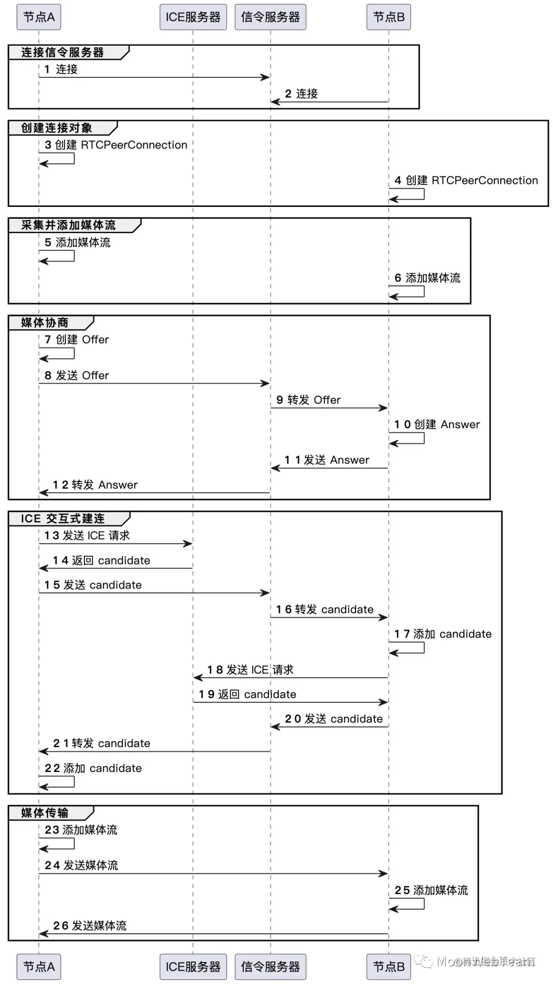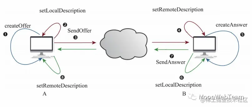 这个阶段云游戏客户端和云游戏设备端主要就是运用上一阶段从信令服务器拿到的 WebRTC 初始化配置来初始化 WebRTC 的连接对象,生成本地的媒体信息,并创建 offer 和 answer,通过信令服务器交换 offer 和 answer。