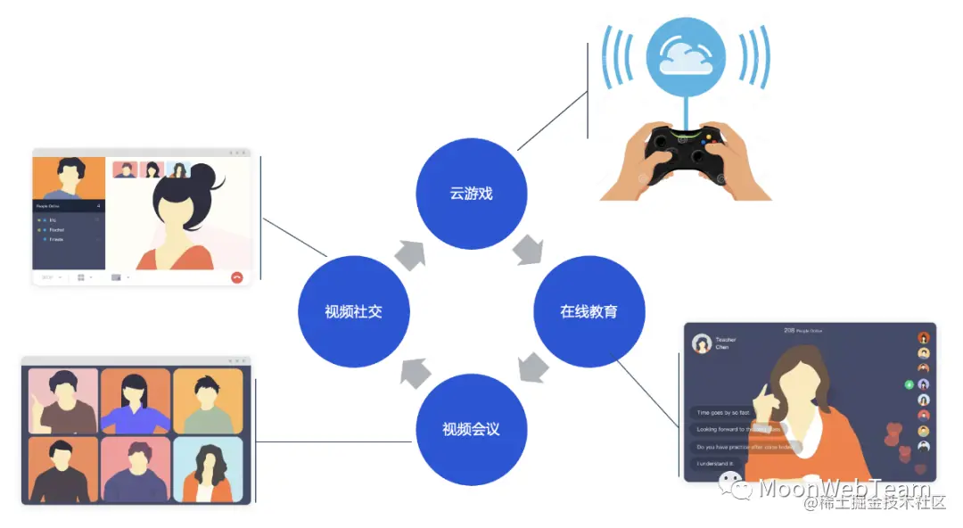 云游戏中运用了 WebRTC 来录制云设备中游戏实时的画面的声音,再通过网络流媒体传输,实时传送到玩家的游玩端,通过 WebRTC 解码,在玩家的设备播放实时的音视频。