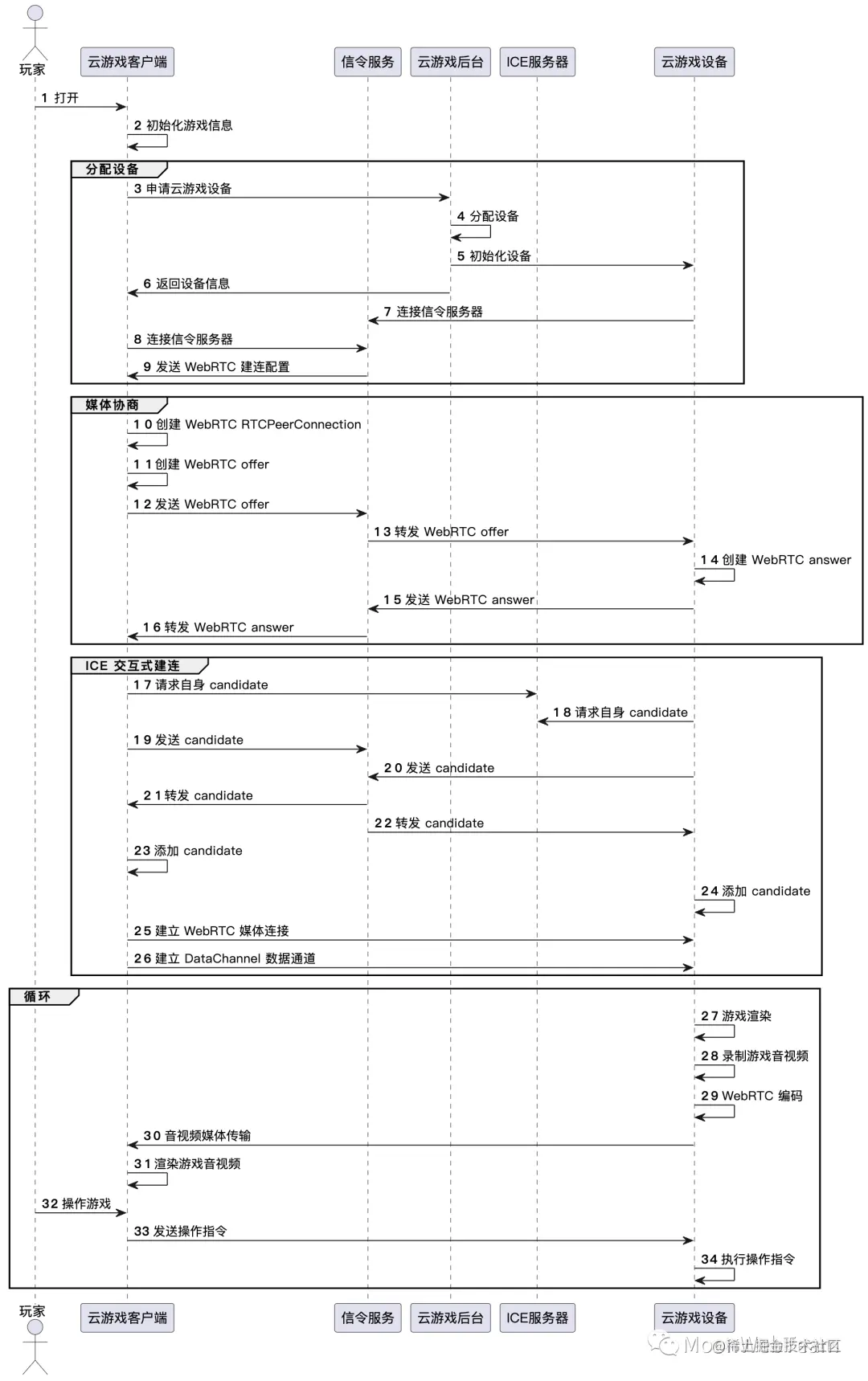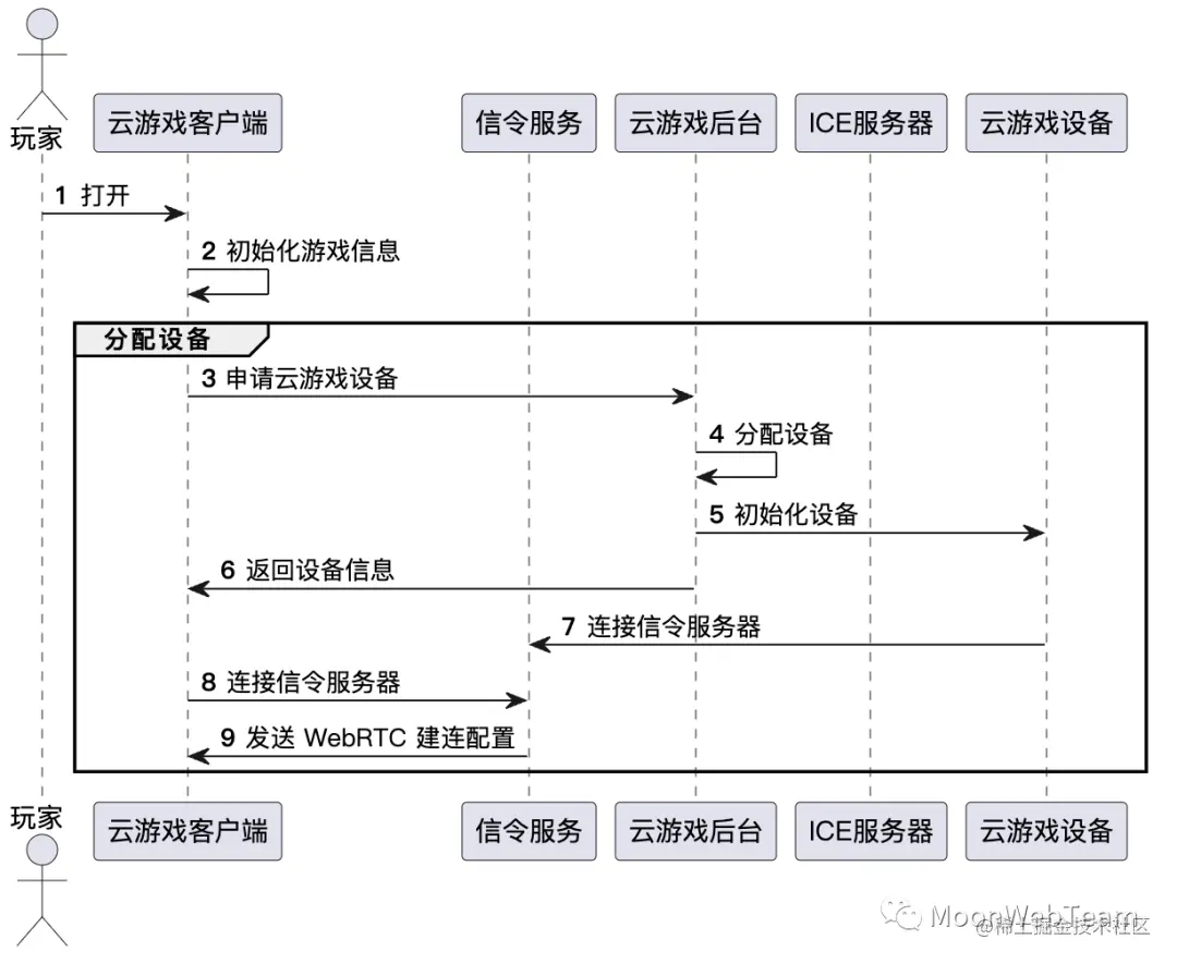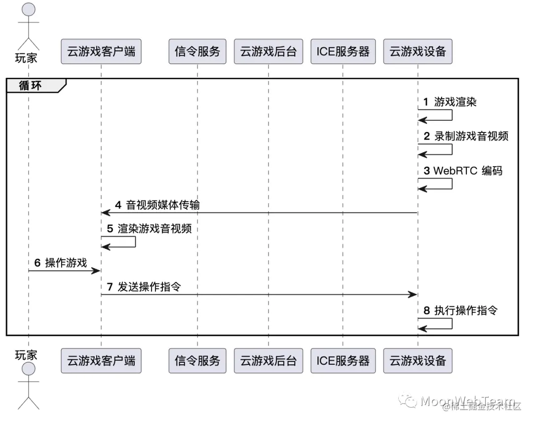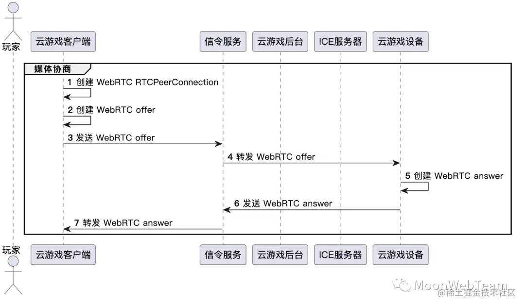 下图展示了云游戏 WebRTC 从初始化,建立连接到游戏画面音频传输,及玩家操作传输的完整过程。