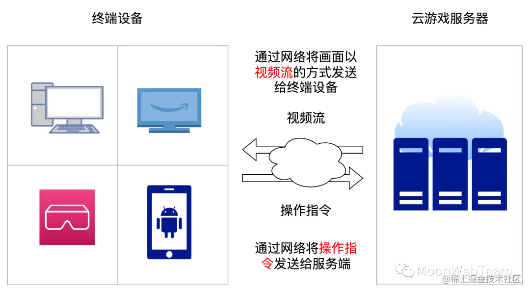 在云游戏中,用户的设备充当终端,只负责显示云端的游戏画面并收集用户操作,可以是PC、电视、VR一体机或手机等。