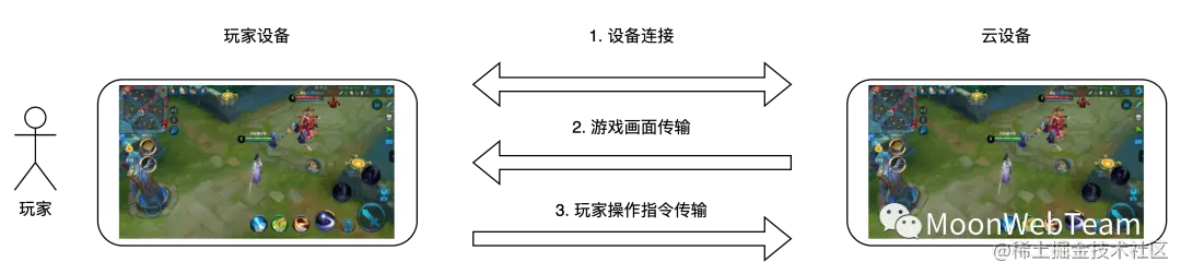 另一方面玩家操作游戏的动作,会被云游戏客户端捕获,并打包成指令发送给云游戏设备,到达云游戏设备后,再在游戏上回放玩家的操作。