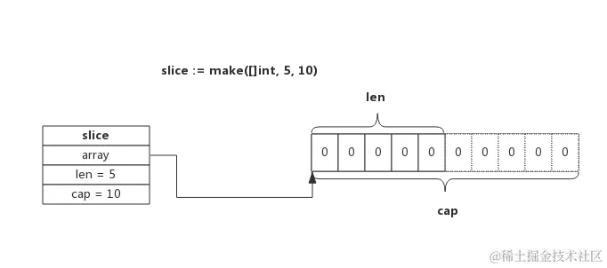 例如,语句slice := make([]int, 5, 10)所创建的Slice,结构如下图所示: