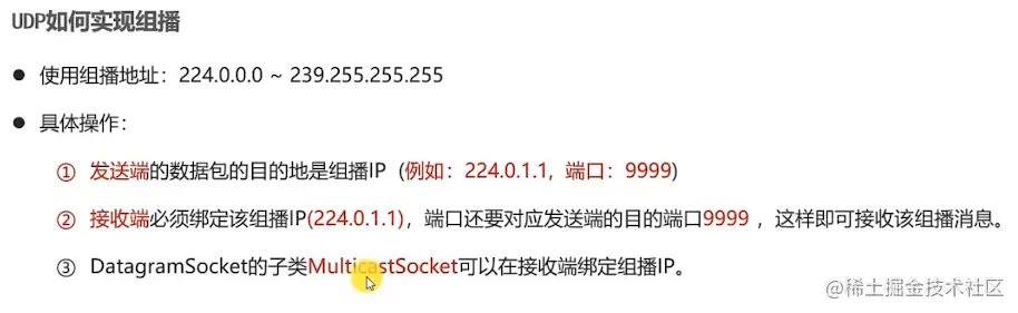// 创建接收端对象 MulticastSocket socket = new MulticastSocket(9999);// 绑定对应组播地址// socket.joinGroup(InetAddress.getByName("224.0.1.1")); /** * 第一个参数,是组播的地址。有两个参数一个ip地址一个是端口 * 第二个参数是接收端主机地址所在的网段。当下使用的是当前主机默认所在的网段 */ socket.joinGroup(new InetSocketAddress(InetAddress.getByName("224.0.1.1"), 9999), NetworkInterface.getByInetAddress(InetAddress.getLocalHost()));