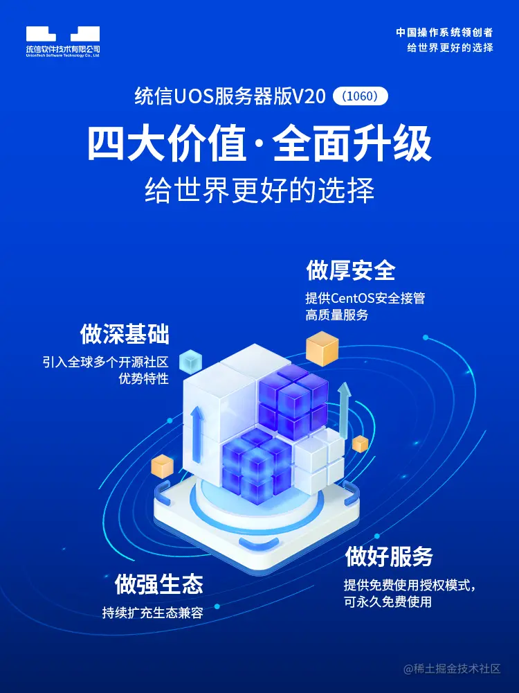 统信软件正式公布统信 UOS 服务器版 V20(1060)的进化方向:紧跟社区主流技术、高度落实国家标准、优化提升客户体验。