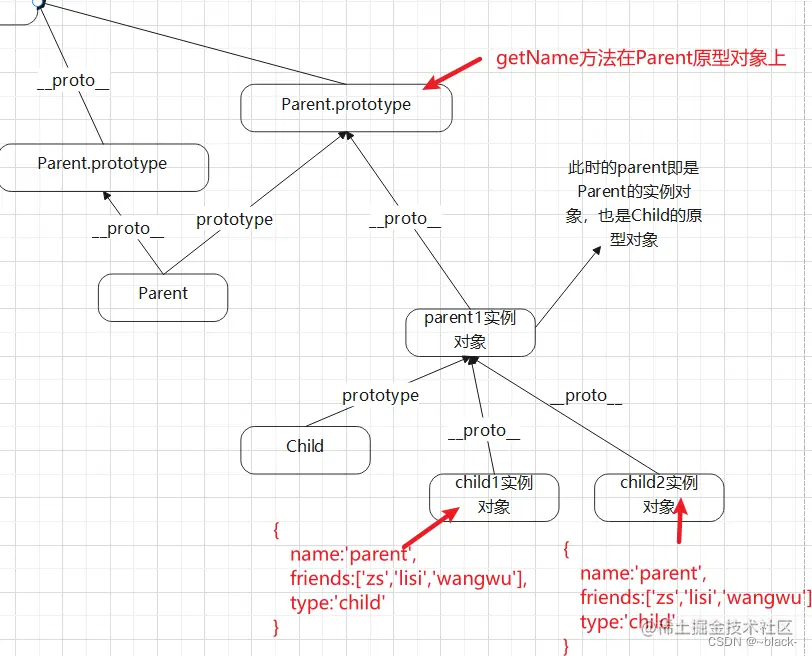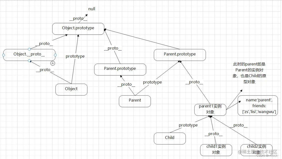 下图是上面例子的原型关系图,可以知道 Child.prototype 执行了Parent的实例对象parent1,当改变child1对象的 friends的值时,child1实例对象本身没有这个属性,就会向上查找,找到了parent1实例对象身上,而child1 和 child2 指向了同一个 parent1实例对象,内存空间是共享的