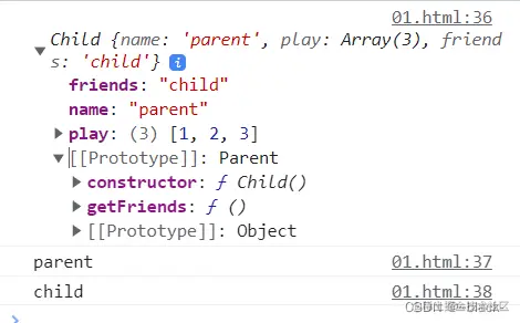 console.log(child); //{friends:"child",name:"parent",play:[1,2,3],__proto__:Parent}