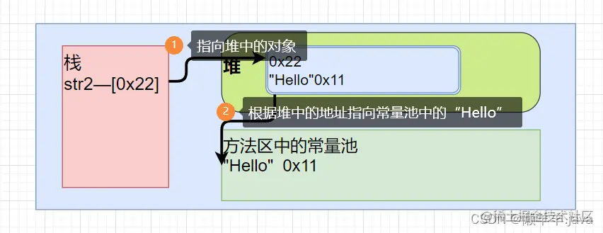 先在堆中创建空间,里面具有value属性,指向常量池的"Hello"空间。如果常量池没有"Hello",重新创建,如果有则直接通过value指向。最终指向的是堆中的空间地址。 根据以上的创建过程,不难看出方式一是直接指向常量池中的字符串常量,方式二则是先指向堆中,然后根据堆中的地址指向常量池中的字符串常量