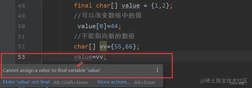 拿下面的例子来说,char类型的数组被final修饰,表示value不可指向新的数组,但是当前数组里面的值是可变的。