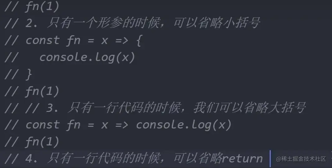 2.箭头函数只有一个参数时可以省略圆括号 ()
