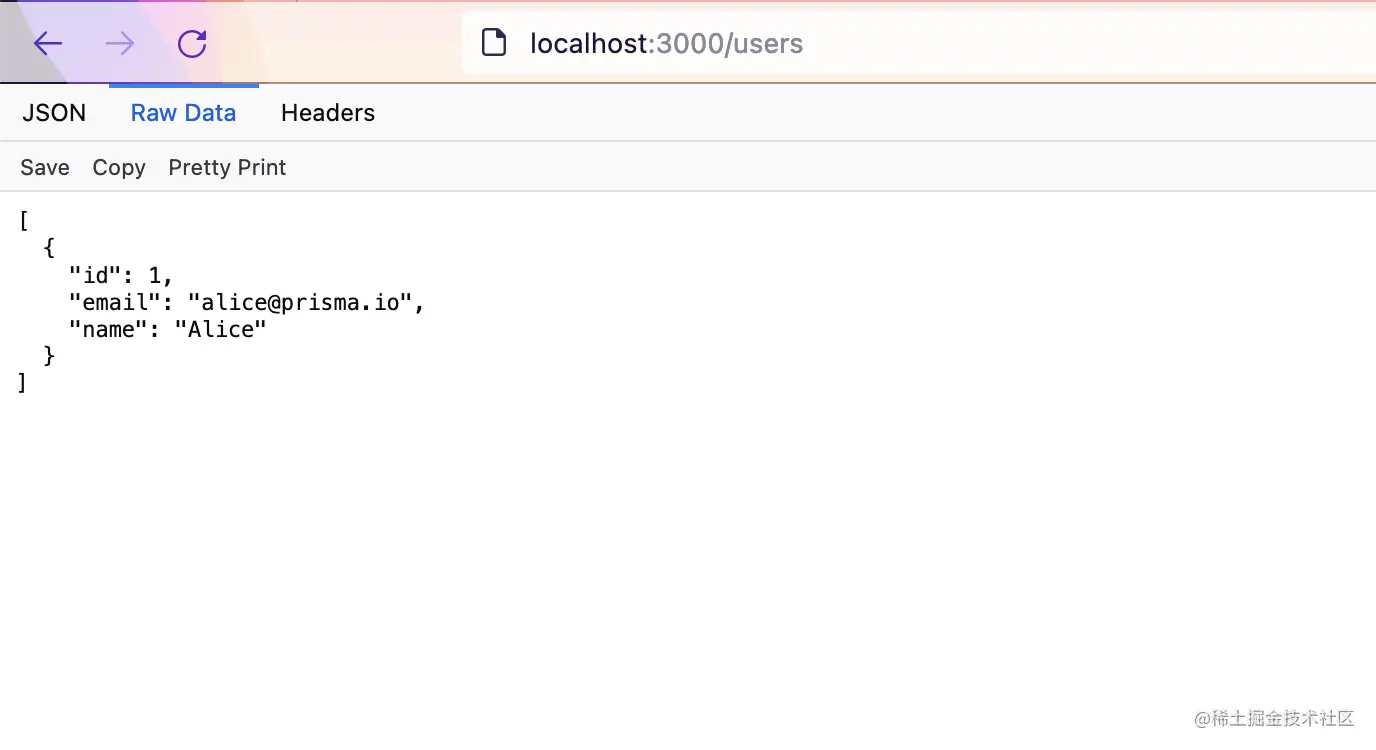 然后在浏览器中访问 http://localhost:3000/users ,可以看到返回的 JSON 数据。