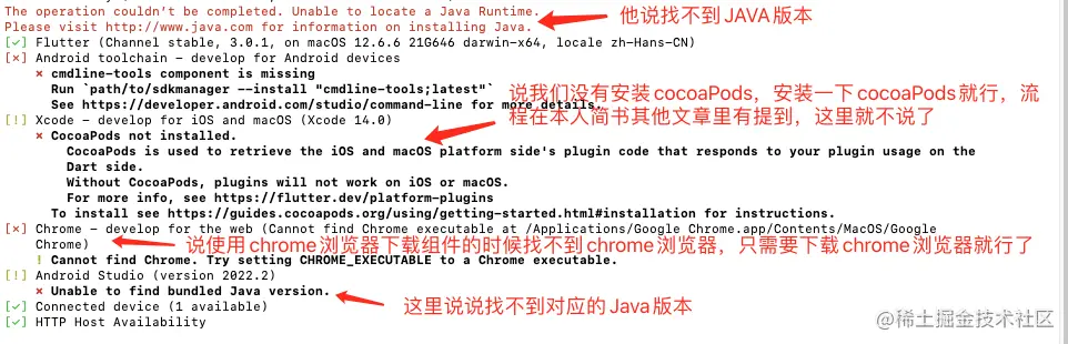 在我们很多小伙伴费尽千辛万苦后搭好Flutter环境后,在终端运行“flutter doctor”后依然报错,此时初学者的小伙伴一脸蒙B了,内心一万个“草泥马”在跑,下面我们一一来看,下图就是本人操作报错