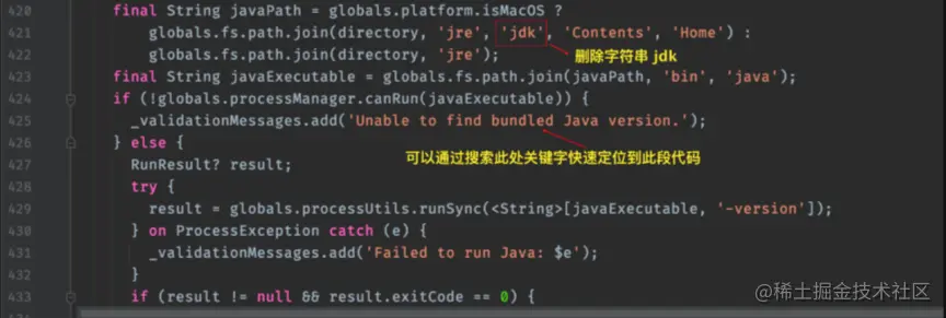 1 找到你本地的FlutterSDK,依次找到 flutter / packages / flutter_tools / lib / src / android / android_studio.dart ,打开 android_studio.dart 文件后,滑动到最下面,删除掉下图所示代码处的字符串 jdk 。