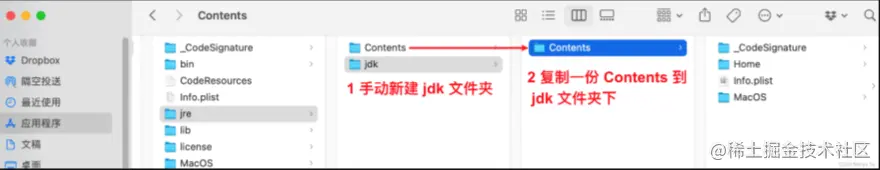 然后再依次点开 Contents / jre,你 jre 文件夹下目前应该是只有 Contents 文件夹,复制该 Contents 文件夹后,手动在 jre 文件夹下新建一个 jdk 文件夹,然后把刚才复制的 Contents 文件夹粘贴到 jdk 文件夹下,如下图所示
