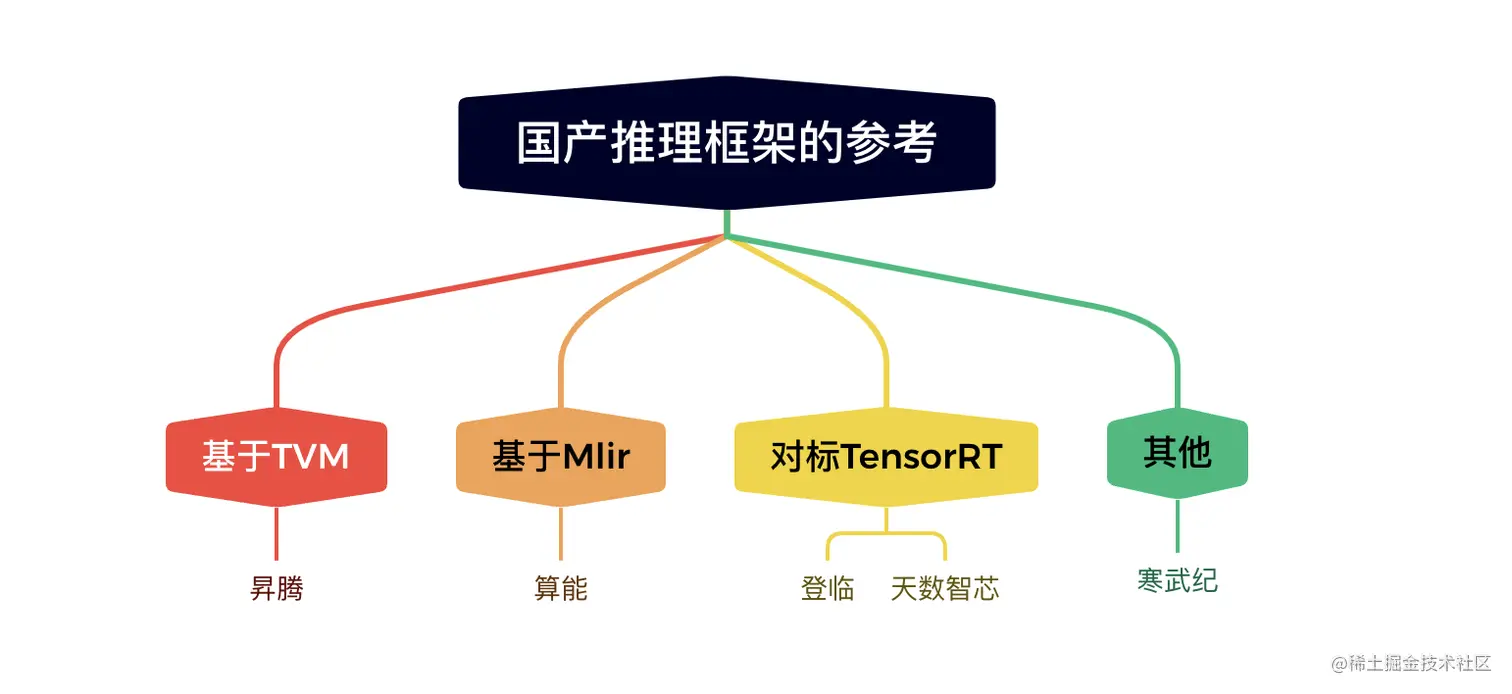 本文所讨论的推理框架可能会涉及英伟达的 TensorRT、NCNN、Tengine 以及一些国产硬件厂商的配套推理引擎。在众多的推理引擎中,英伟达的 TensorRT 可谓是翘楚中的翘楚,标杆中的标杆。标杆到什么程度呢,举个例子,咱们国产 AI 芯片厂商的新贵天数智芯、登临,他们的推理引擎都是完全对标 TensorRT 的,意思是一些接口、推理流程的组织方式都是力求和 TensorRT 保持一致,目的是为了借用英伟达的生态,降低用户层的迁移成本。