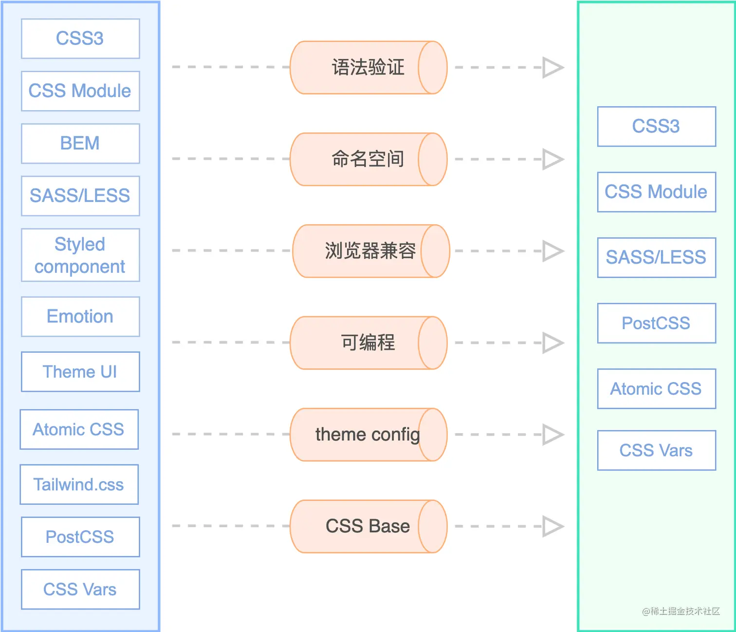 基于上述的分析,基于关键痛点和目标,例如,语法验证、命名空间、浏览器兼容、代码压缩、可编程、theme config、CSS Base等,我们筛选出,实现样式管理的目标工具。如下图: